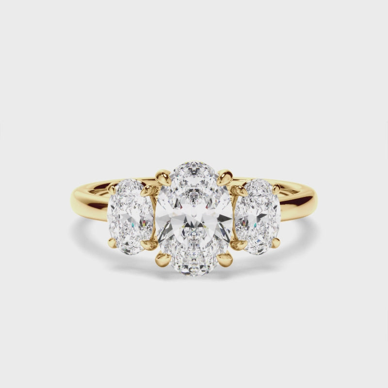 This timeless custom-made oval cut diamond trilogy engagement ring, made with your choice of diamond centre stone, features oval cut diamond side stones and a half round band. Exuding fluidity in its line work, and boasting an elegant silhouette, as with all the pieces in our Bespoke Collection, this piece is made especially for you.