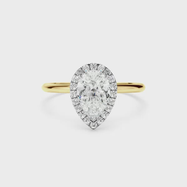 This timeless custom-made engagement ring, made with your choice of diamond centre stone, features a pear cut diamond adorned in a halo of round brilliant cut diamonds. Exuding fluidity in its line work, and boasting an elegant silhouette, as with all the pieces in our Bespoke Collection, this piece is made especially for you.
