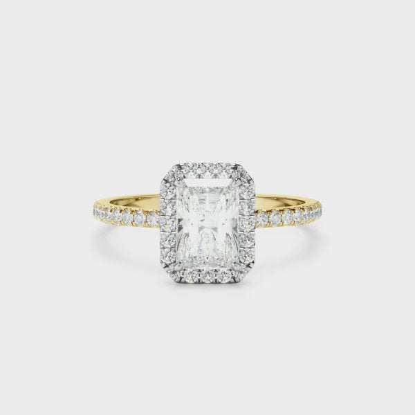Radiant Cut Diamond Halo Engagement Ring With Pave Band