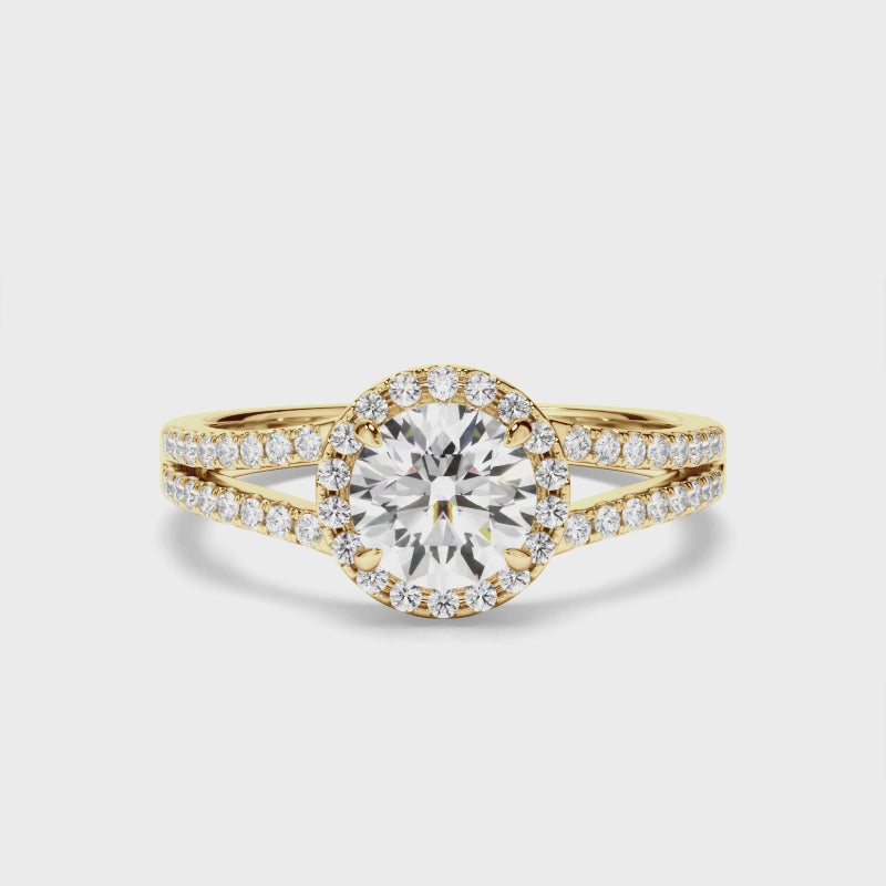 This timeless custom-made round brilliant cut diamond halo engagement ring, made with your choice of diamond centre stone, features two rows of pave diamonds across a square split band. Exuding fluidity in its line work, and boasting an elegant silhouette, as with all the pieces in our Bespoke Collection, this piece is made especially for you.